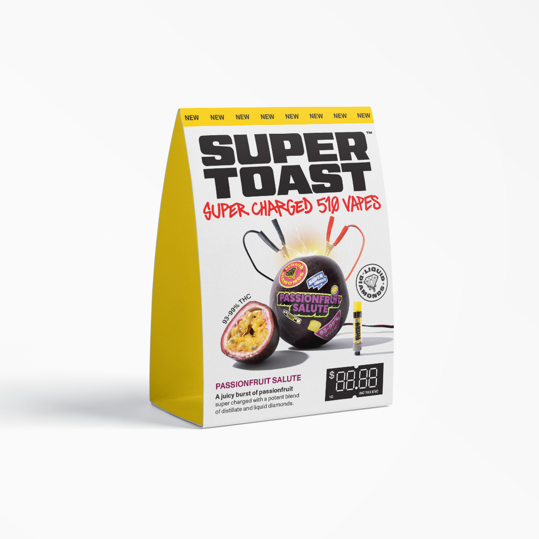 Super Toast- 510 Vapes- Passionfruit Salute- Tent card 4 x 6″